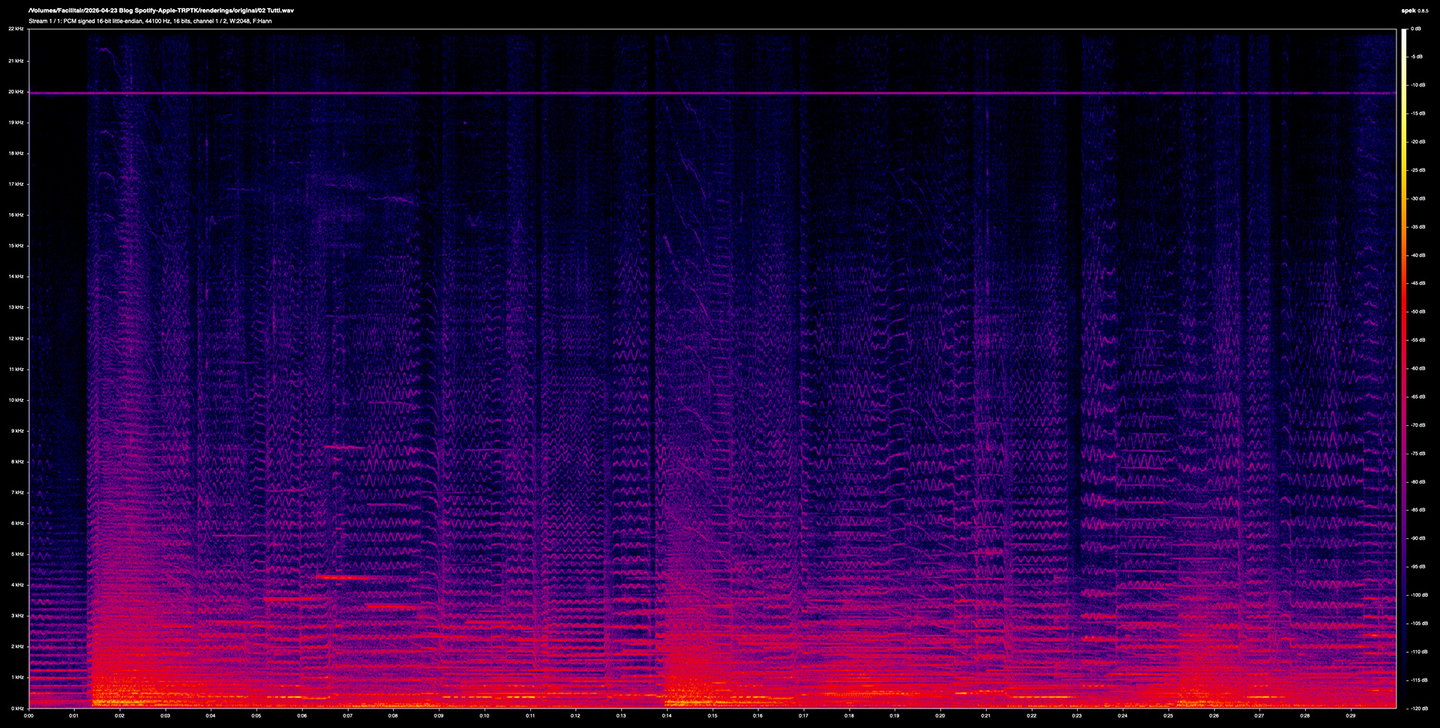 Furthermore, talking about codecs is basically inseparable from talking about mastering. A loud, limited master sounds fine through any of these codecs because the codec's failures line up with what was already destroyed in mastering. An untouched dynamic master exposes the codec honestly, in both directions: the codec has to work harder, and you can see it working. That is part of why we record and master the way we do, and it's why these comparisons are visible at all. If we were to master like anyone else, you wouldn't see a genuine difference on a spectrogram, because there wouldn't be one worth measuring.
