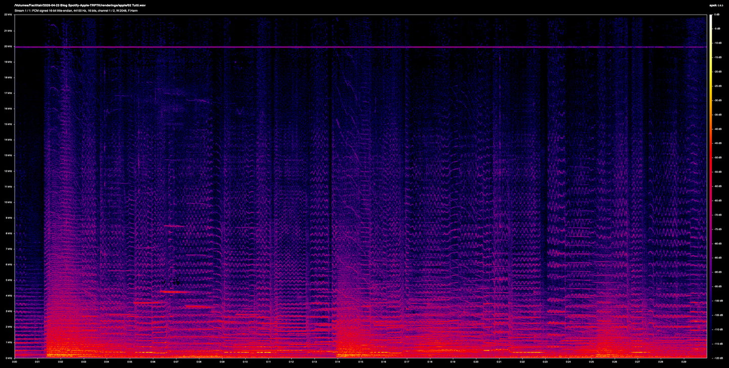 Zooming in further reveals each codec's character even clearer. Apple's AAC codec is tightly clustered around the first few note attacks of solos, and drops towards the noise floor between them. Spotify's Ogg Vorbis is visible throughout the decay trails, broader, higher in frequency, and more continuous. In the tutti sections, both codecs are harder at work; Apple's error stays below roughly 8 kHz and is distributed evenly, whereas Spotify's extends further up into the 20 kHz region with a visible low-frequency band below 2 kHz throughout.