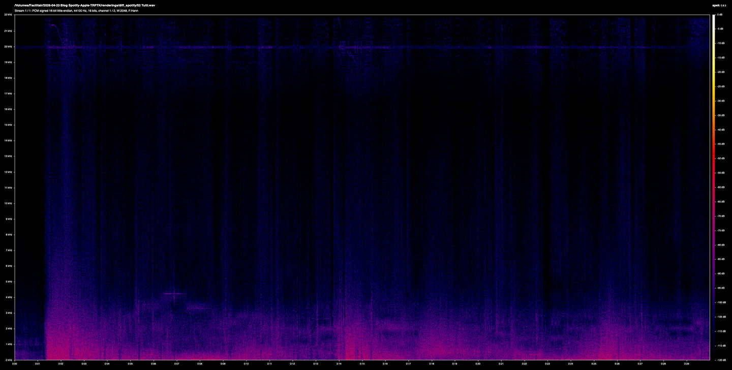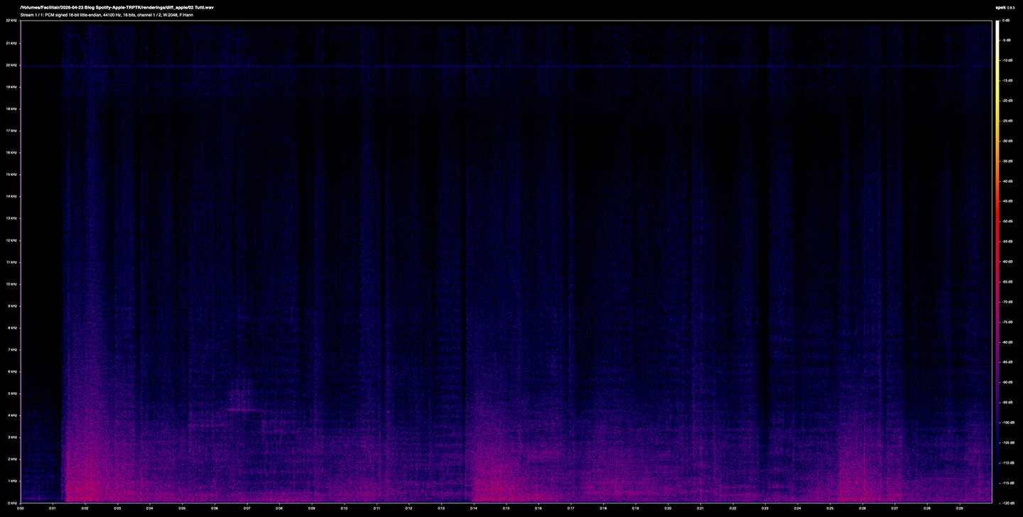 Spotify's error is much broader in frequency and more continuous in time. Energy extends well into the 3-4 kHz region even during quieter passages, and the shape of the error tracks the music more visibly. You can see the structure of the piece in a way you can't really in the Apple one.